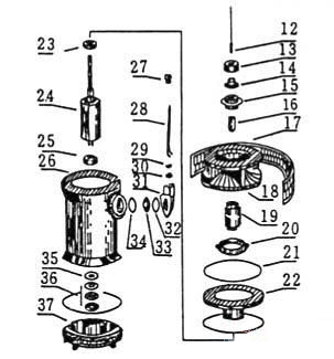 1.接頭 2.泵體(導向件) 3,耳擎 4.導葉 5.轉(zhuǎn)子螺母墊國 6.墊圈
