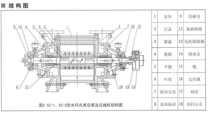 SZ-1及SZ-2的結(jié)構(gòu)如(圖3)所示,其與SZ-3及SZ-4結(jié)構(gòu)(圖4)不同之處是:進(jìn)、排氣管分別在兩個側(cè)蓋上,一根管與進(jìn)氣口相通,一根管與排氣口相通,泵內(nèi)無橡皮閥。
