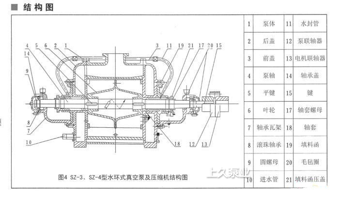 進(jìn)氣管(10)與氣水分離器聯(lián)在一起鵂給泵所需要的循環(huán)水,為了使泵腔的兩端面間隙和填料得到很好的密封,必須由水封管(11)不斷地鵂給干凈的冷水。在聯(lián)軸器端為了不使軸承內(nèi)油外漏,因此裝有毛氈圈(20)來密封。