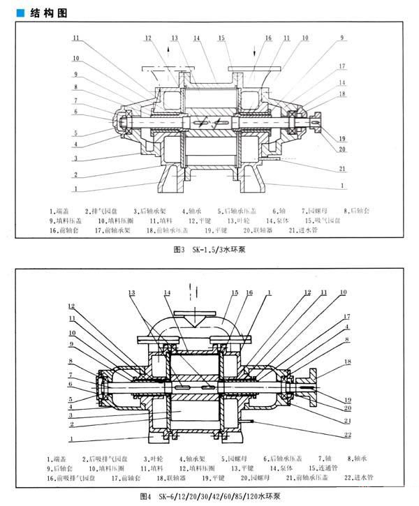 泵由泵體、兩個端蓋、葉輪、軸等部件組成。進氣和排氣竹通過安裝在端蓋上的園盤上的吸氣孔和樣氣孔與泵腔相連,軸偏心地安裝在泵體中,葉輪用平鍵固定在軸上。泵兩端而的總間隙山泵體和園盤之間的墊來調(diào)整,葉輪與端蓋上的園盤之間的間隙由軸套(SK-1.5/3/6)或背帽(SK-12/20/30)推動葉輪來調(diào)整,而(SK-42以上軸與葉輪為過盈配合,此間隙由前端定位時確定.SK-42-60-85-120無軸套,其余結構與SK-6/12/20/30相同。葉輪兩端面與端蓋園盤的間隙決定氣體在泵腔內(nèi)由進氣口至排氣口流動中損失的大小及其極限壓力。