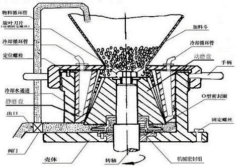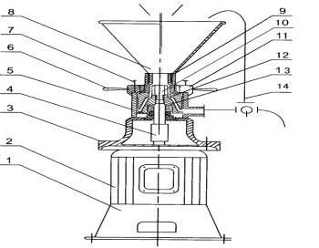 9.進料通道 10.旋葉刀 11.調(diào)節(jié)盤 12.靜磨盤 13.動磨盤 14.循環(huán)管