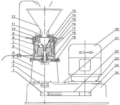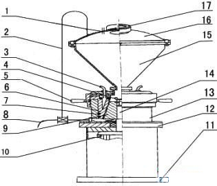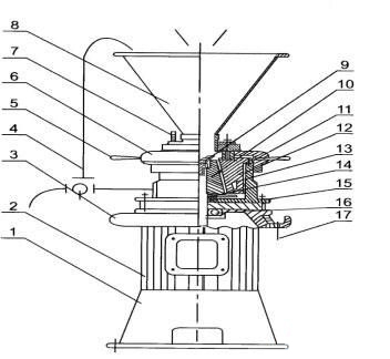 9.手柄10.壓蓋 11.活接 12.加料斗 13.旋葉刀 14.動磨盤 15.靜磨盤 16.調(diào)節(jié)盤