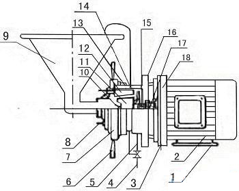 17.機械密封組件 18.殼體 19.冷卻水進出口及排泄孔20. 電動機 21.調(diào)節(jié)螺釘