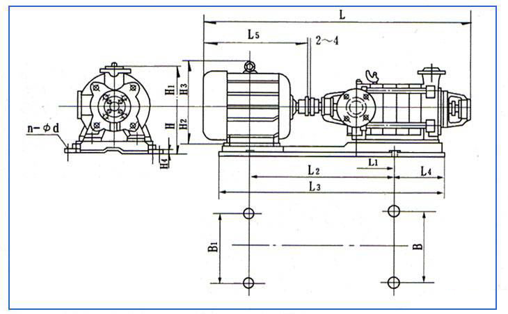 D型(原DA1型)臥式多級(jí)離心泵安裝尺寸圖: