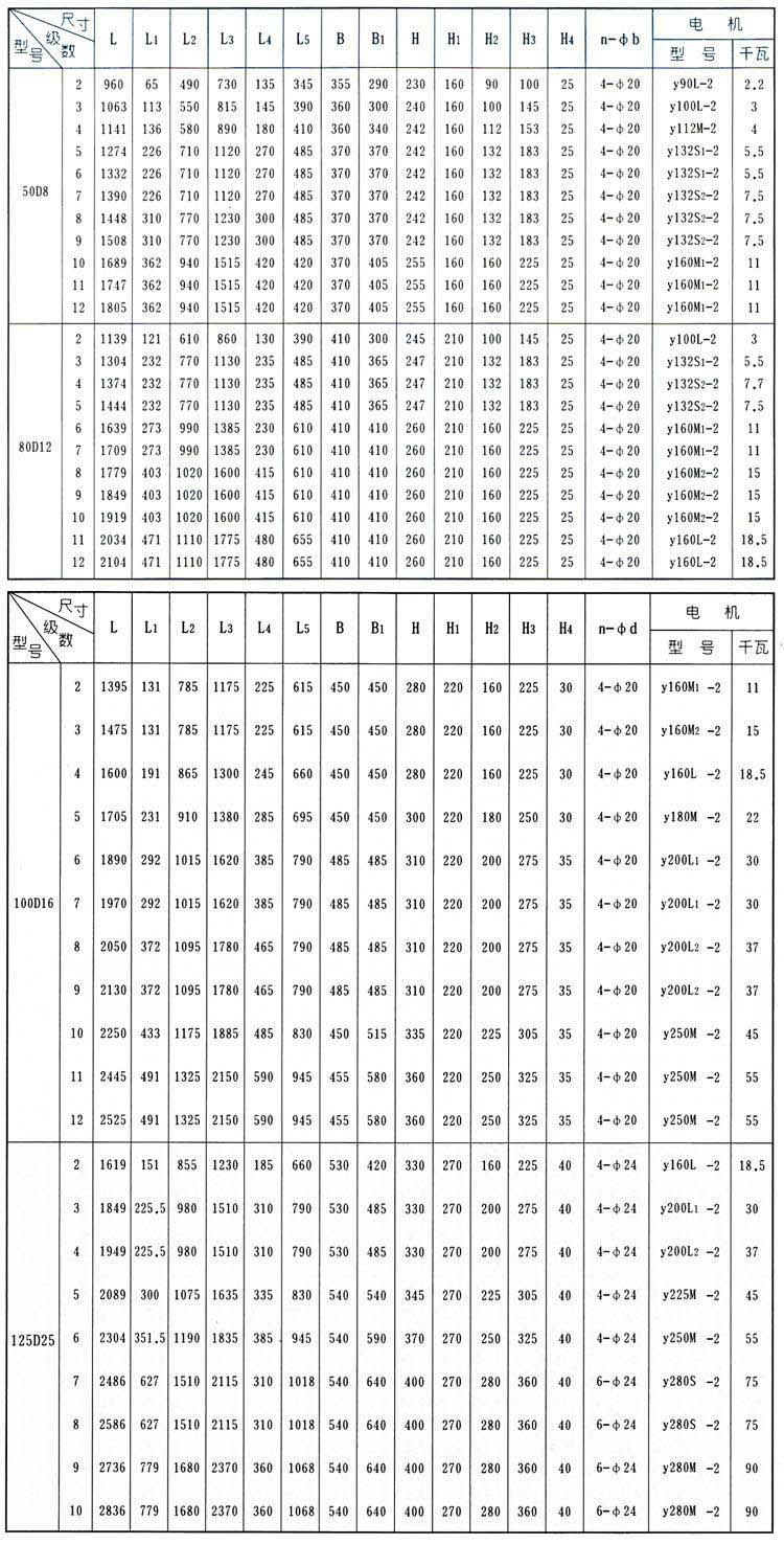 D型(原DA1型)臥式多級(jí)離心泵安裝尺寸表:
