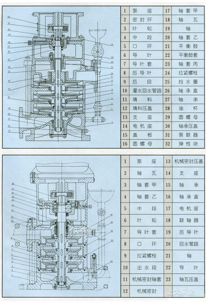 泵座、中段、后段、葉輪、導(dǎo)葉套、導(dǎo)葉、后導(dǎo)葉、支座、電機(jī)座、軸-乙、密封環(huán)均為銹鐵制成.