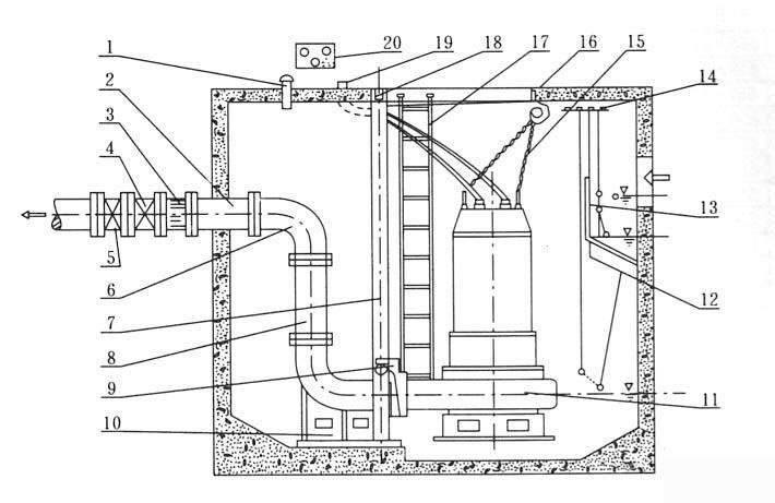 12.浮球開(kāi)關(guān)(水位開(kāi)關(guān))13.隔板 14.浮球固定架 15.小鏈 16.掛鉤 17.人梯 18.支撐架 19.電纜出線管 20.電機(jī)保護(hù)器