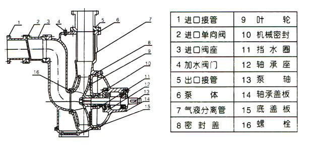 ZW系列自吸式排污泵,主要由泵體.葉輪、后蓋、機(jī)械密封、泵軸、軸承座、進(jìn)口閥、氣液分離管、加水閥門、迸、排接管等組成。泵的結(jié)構(gòu)見圖。