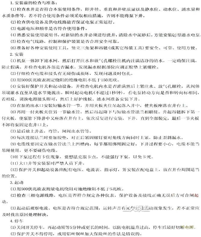 2.水泵進(jìn)水口必須在動(dòng)水位1米位以下,但潛水深度不得超過靜水位以下70米,電機(jī)下端距井底水深最少在1米以上。